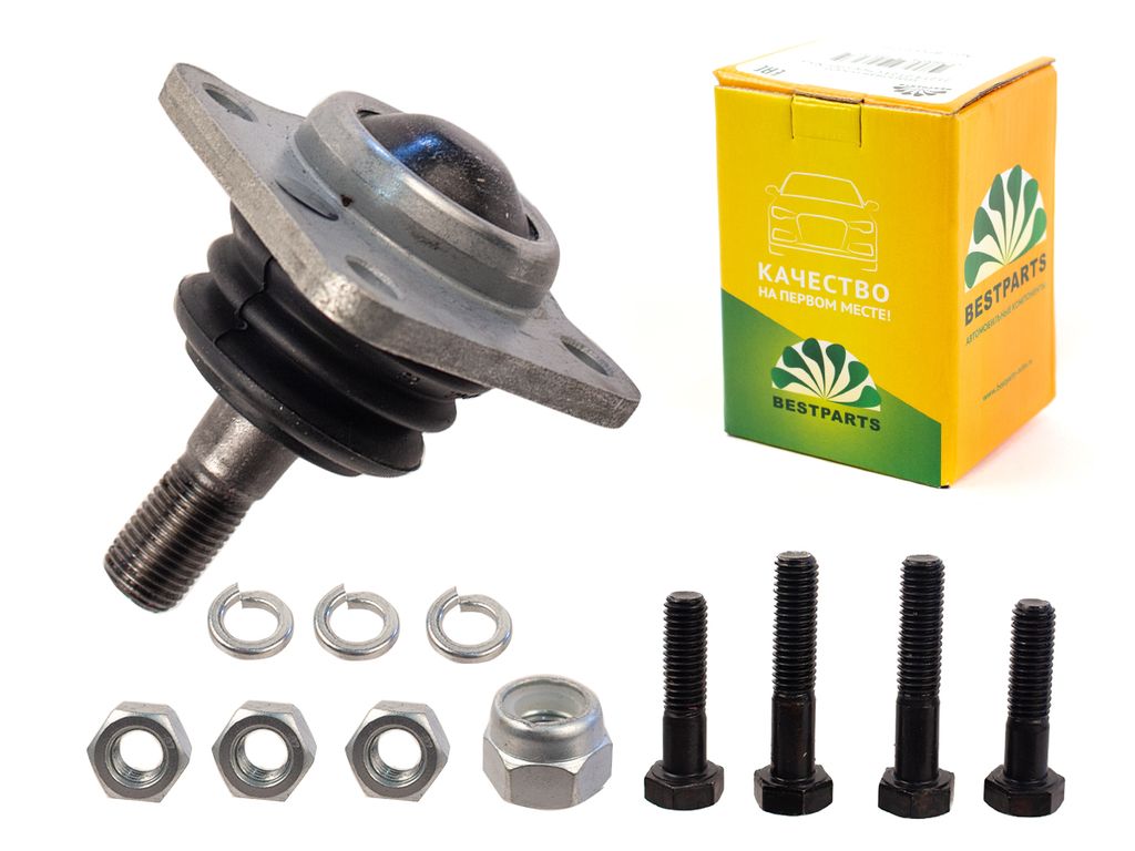 Автомобильная шаровая опора (комплект), применяется для моделей ТС: ВАЗ-21214, ВАЗ-2123 CHEVROLET NIVA. В комплект входит 12 изделий: шаровая опора - 1 штука; гайка шарово-го пальца для крепления к поворотному кулаку - 1 штука; болты - 4 штуки; гайки -